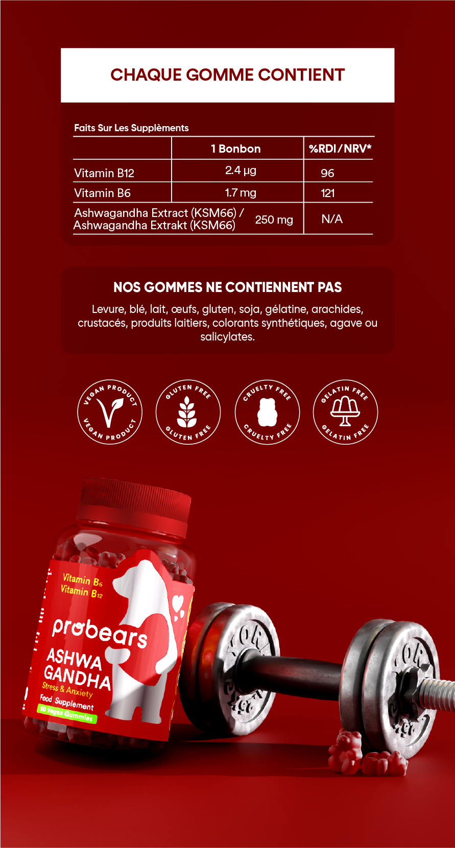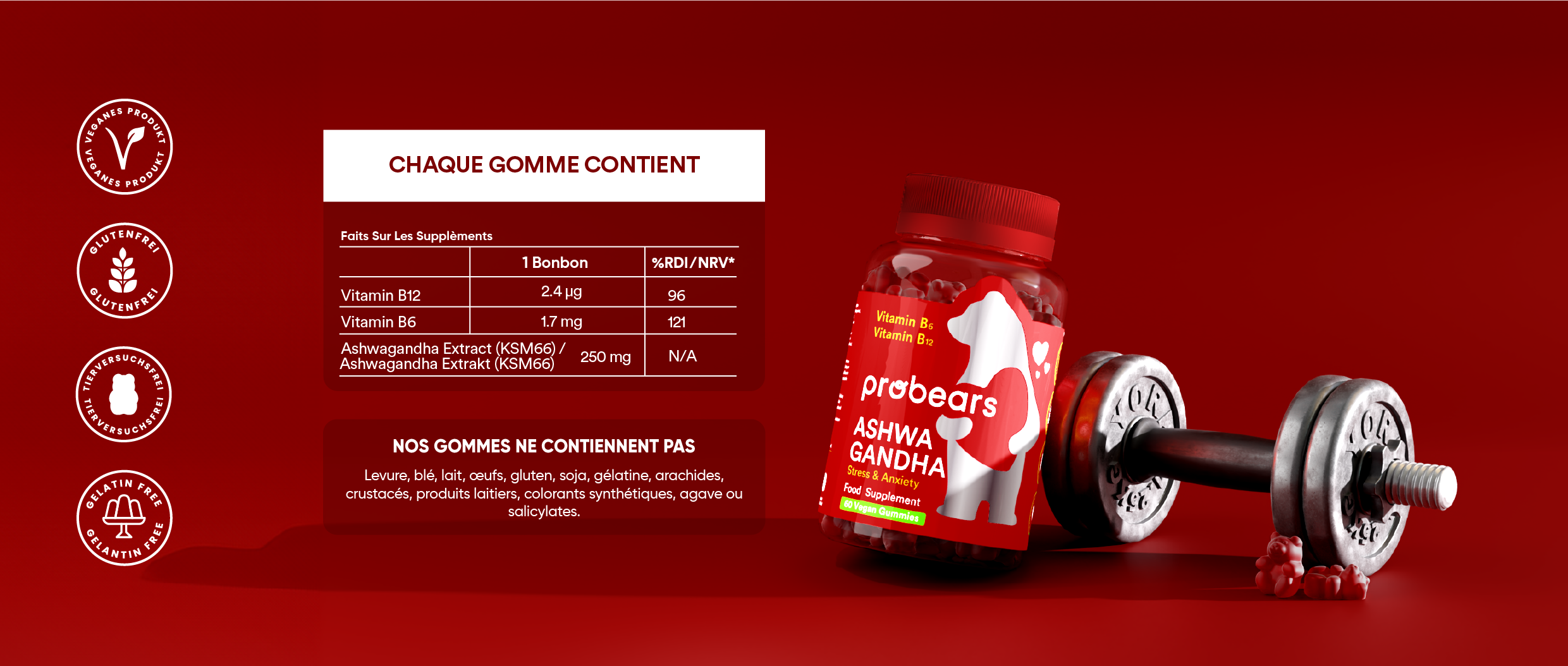 Probears® Ashwagandha (KSM 66) Oursons Gommeux - Ton partenaire parfait dans la lutte contre le stress ! Dis adieu au stress et accueille un esprit serein et concentré. Ces gommes vitaminées véganes, dotées de la puissance naturelle de l'Ashwagandha, aident à gérer le stress et contribuent à un meilleur bien-être.