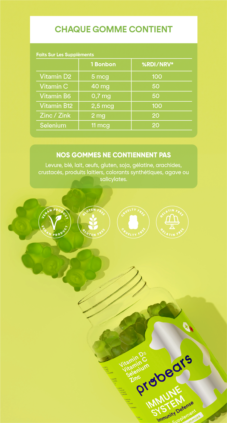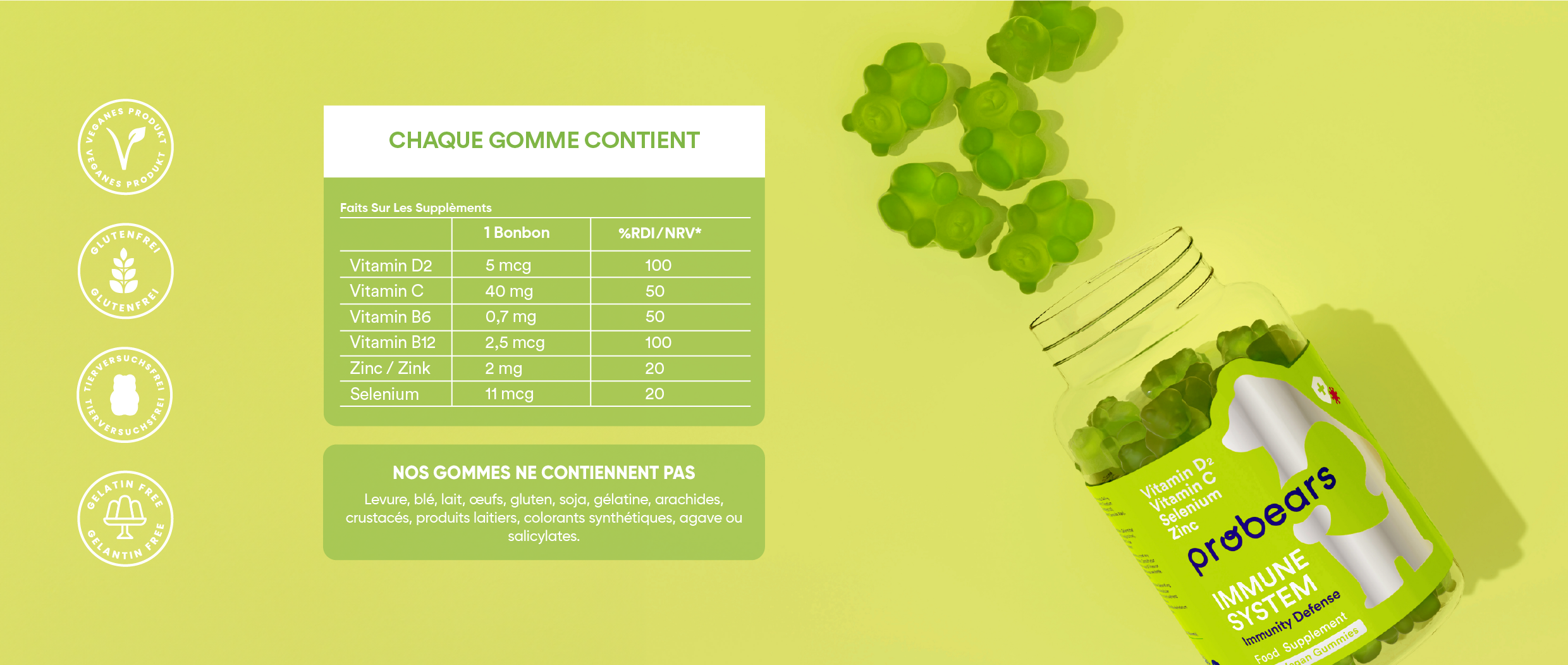 Renforce ton système immunitaire et te protège contre les défis de l'hiver. Dès que la saison froide commence, il devient important de renforcer ton système immunitaire. Nos oursons gommeux Probears® Immune System t'offrent exactement ce dont tu as besoin. Fabriqués en Allemagne, ces gommes multivitaminées hautement concentrées contiennent tous les nutriments essentiels dont ton corps a besoin pour soutenir un système immunitaire fort.