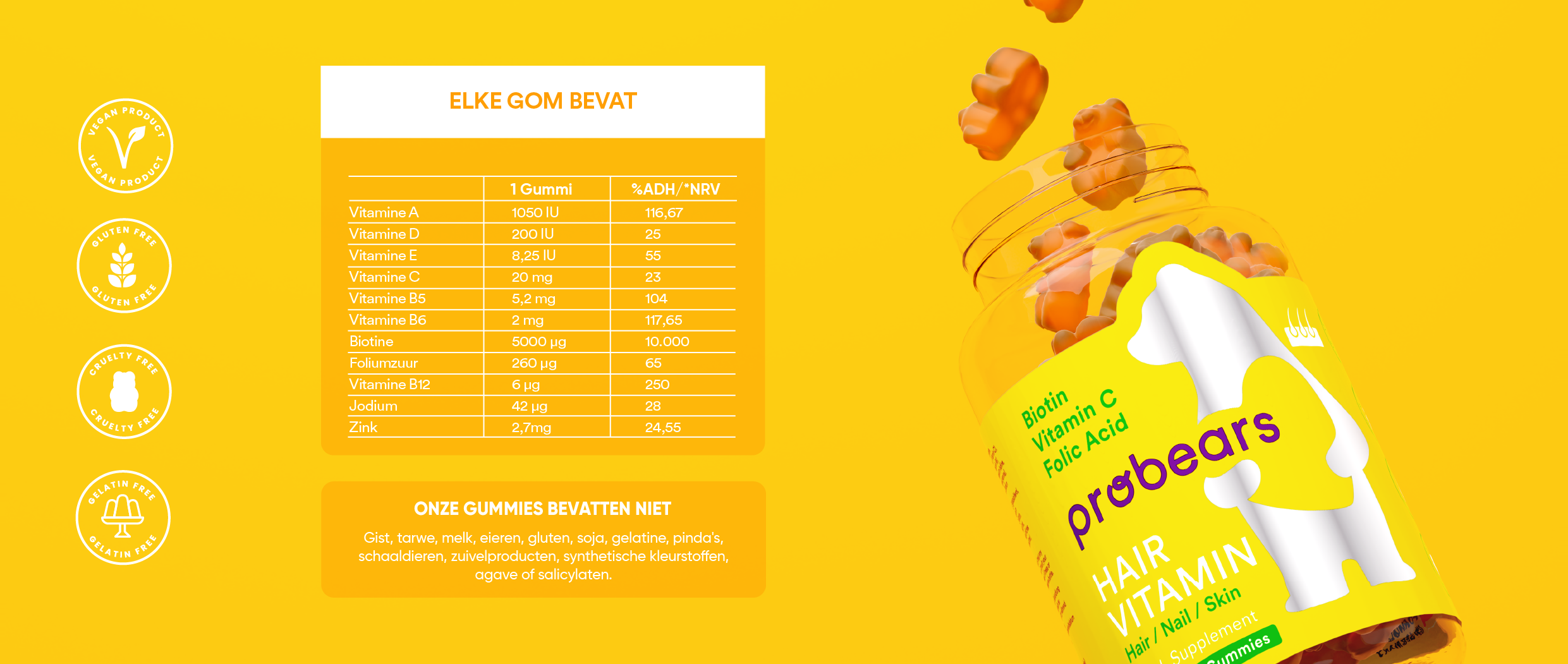 Ben je op zoek naar een heerlijke en gemakkelijke manier om de gezondheid van je haar, nagels en huid te ondersteunen? Probears Hair Vitamin Gummibeertjes zijn precies wat je nodig hebt! Deze heerlijke lekkernijen zitten vol met alle essentiële voedingsstoffen die je haar nodig heeft om gezond, glanzend en sterk te blijven.