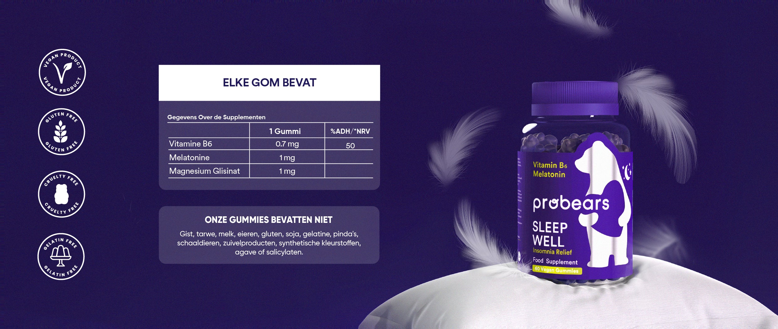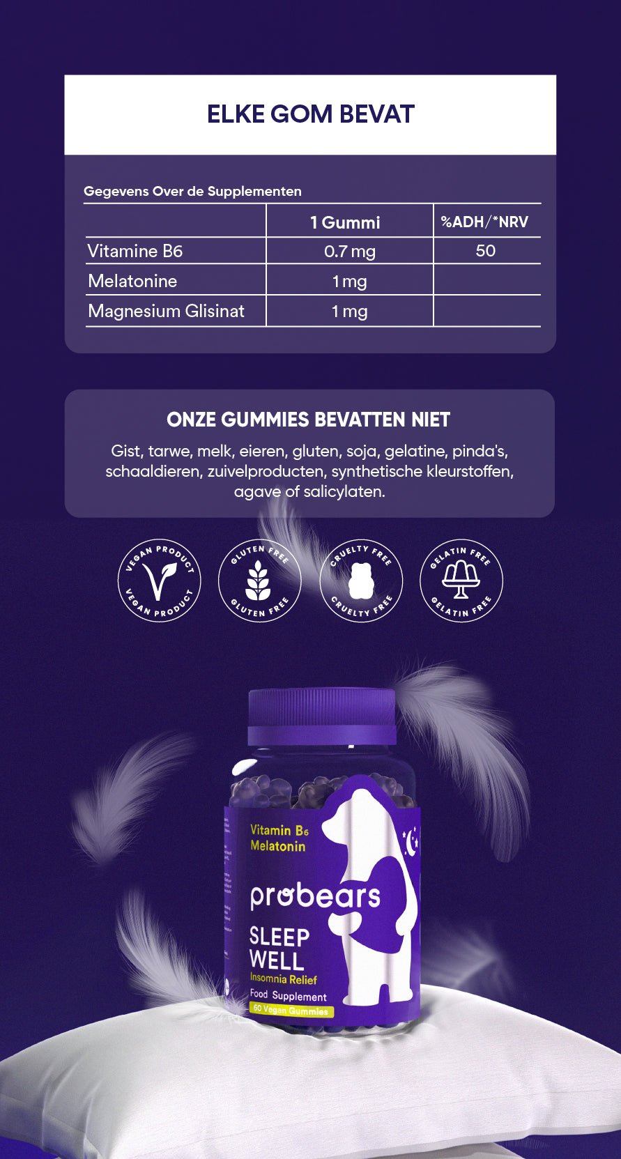 Een goede nachtrust is alles wat je nodig hebt, en onze Sleep Well Gummibeertjes bieden je precies dat! Ze zijn niet alleen lekker, maar ondersteunen ook de regulatie van je slaap-waakcyclus, zodat je verfrist en klaar voor de dag ontwaakt. Het bijzondere aan onze Sleep Well Gummibeertjes is hun krachtige combinatie van ingrediënten die een optimale celherstel bevorderen. De combinatie van melatonine en valeriaanwortel helpt je aan een rustgevende slaap. Zeg vaarwel tegen onrustige slaap!