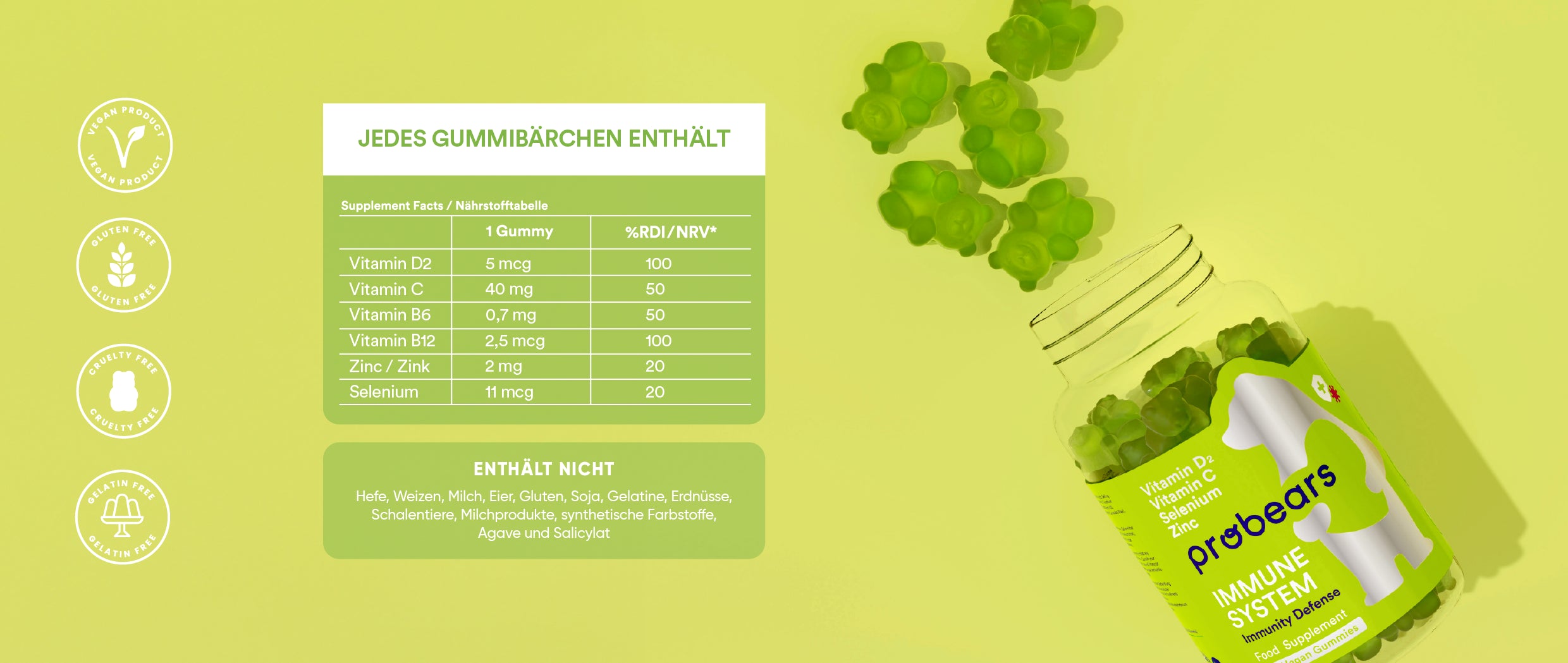 Stärkt dein Immunsystem und schützt dich gegen die Herausforderungen des Winters. Sobald die kalte Jahreszeit beginnt, wird es wichtig, dein Immunsystem zu kräftigen. Unsere Probears® Immune System Gummibärchen bieten dir genau das, was du brauchst. In Deutschland hergestellt, enthalten diese hochkonzentrierten Multivitamin-Gummibärchen alle essenziellen Nährstoffe, die dein Körper benötigt, um ein starkes Immunsystem zu unterstützen.