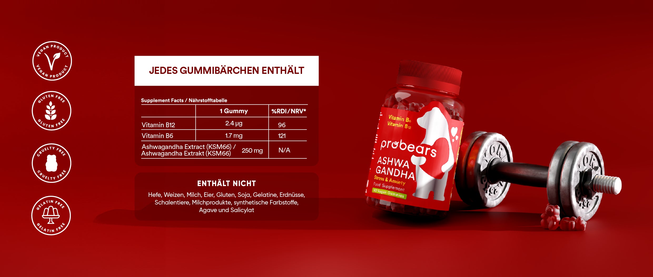 Probears® Ashwagandha (KSM 66) Gummibärchen - Dein perfekter Partner im Kampf gegen Stress! Sag Lebewohl zu Stress und heiße einen gelassenen, fokussierten Geist willkommen. Diese veganen Vitamin-Gummis mit der natürlichen Kraft von Ashwagandha unterstützen die Stressbewältigung und verhelfen zu einem besseren Wohlbefinden.